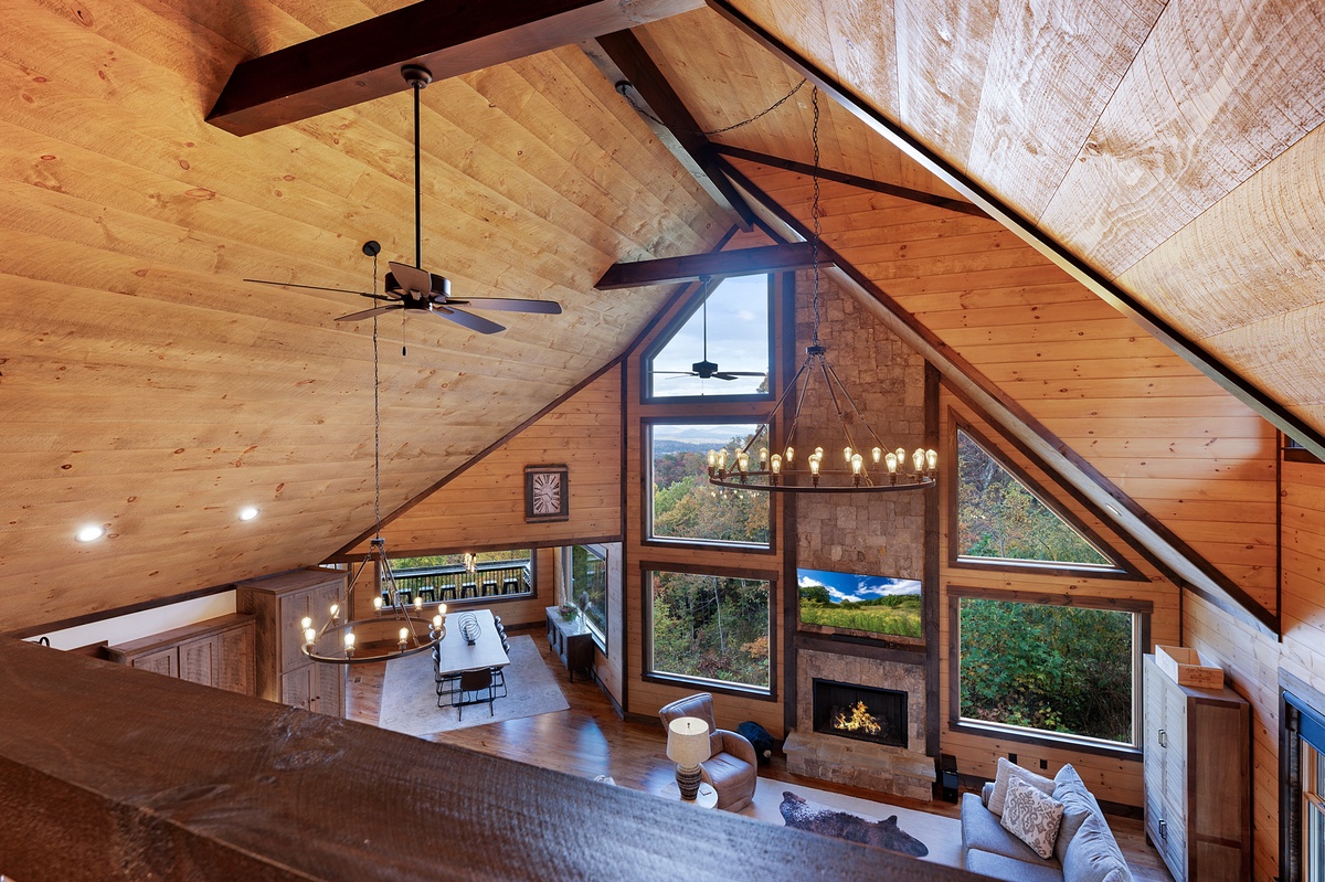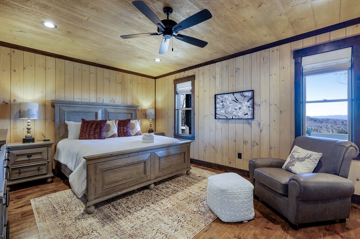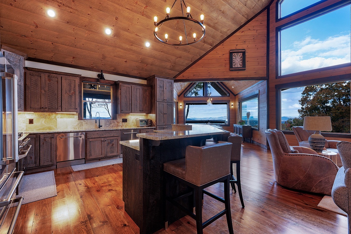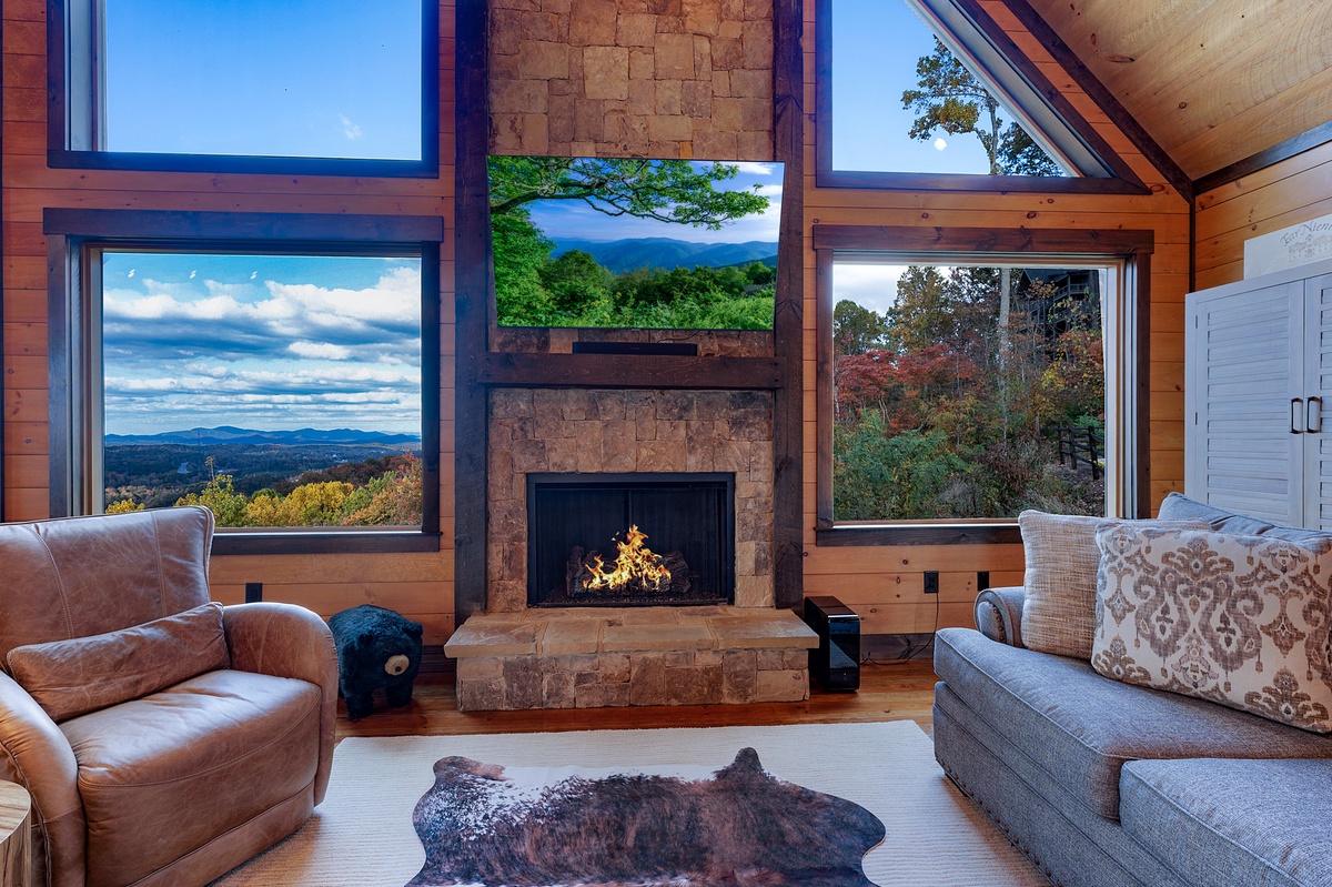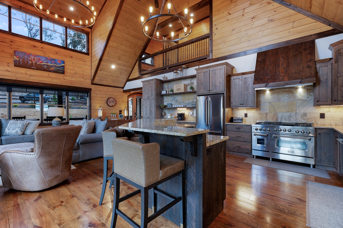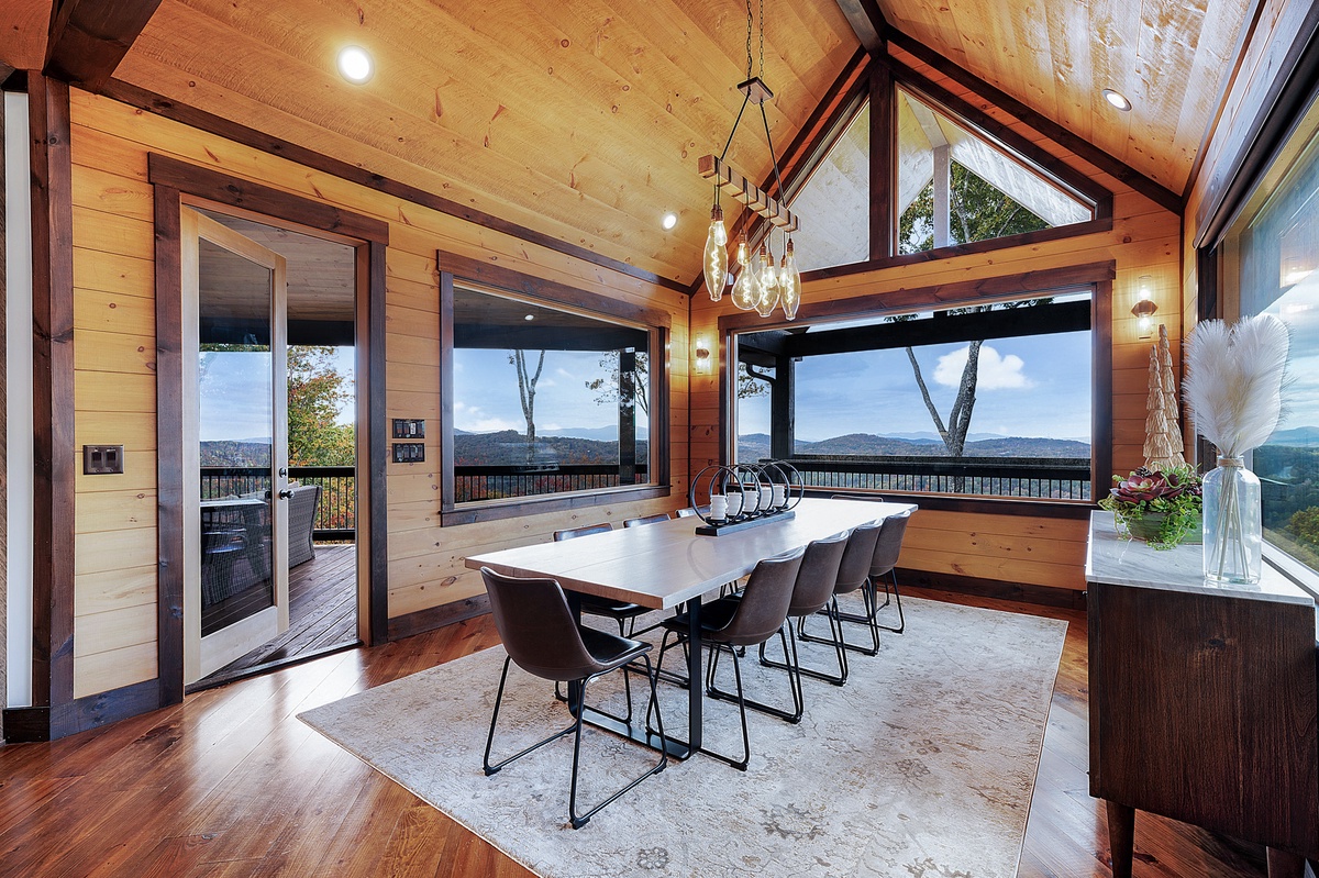 Entering your vacation home, you’ll be greeted by the large, open floor design so beautiful it’s hard to focus your gaze on any one area. The living room with spacious seating, stone laid gas fireplace and extensive windows brings visions of cozy evenings around a crackling fire and friends. The large kitchen, including a gas stove with 6 burners, plus grill plate and two ovens gets those creative culinary artist juices flowing. And the dining area with large surrounding windows, allows you to lose yourself in the beautiful views of those Blue Ridge mountains.