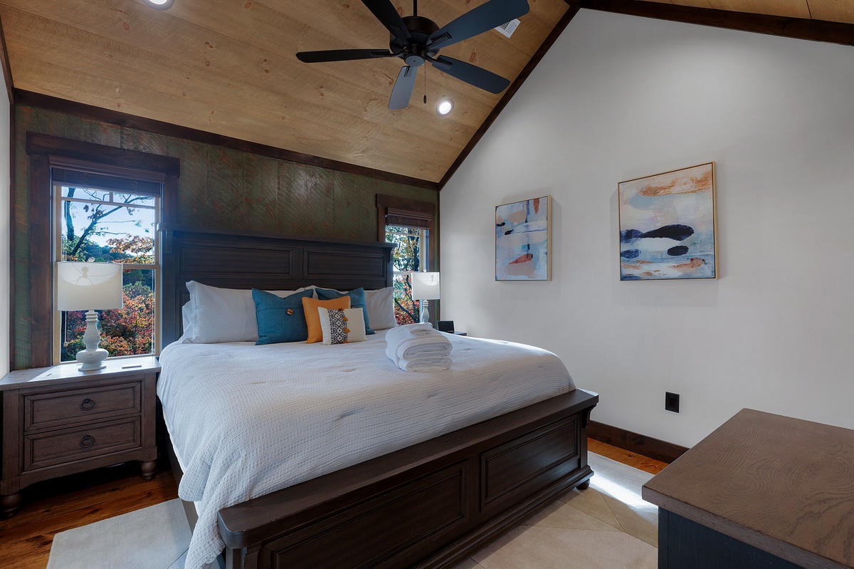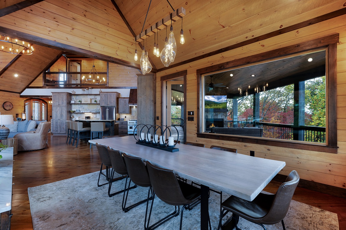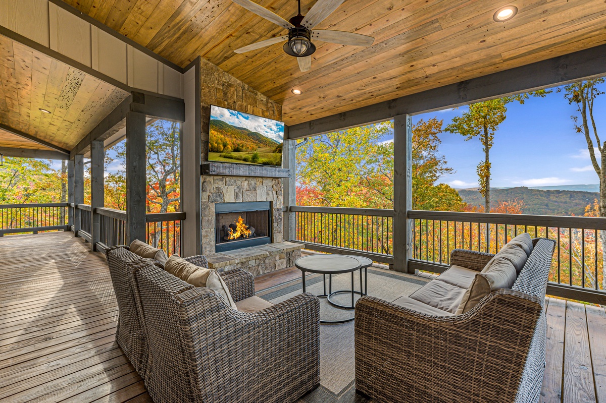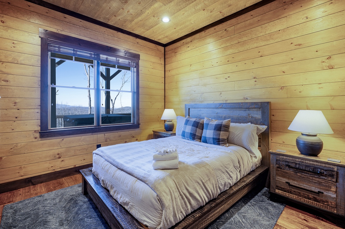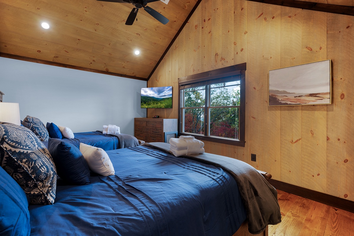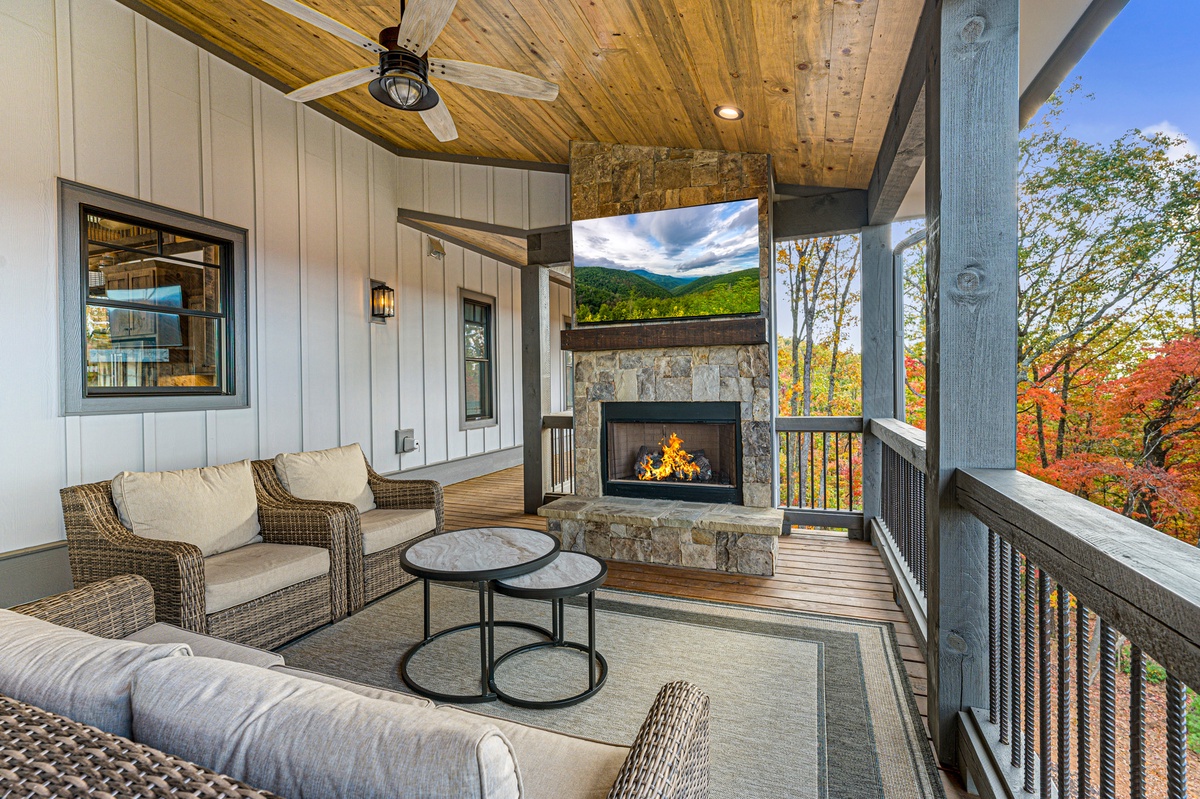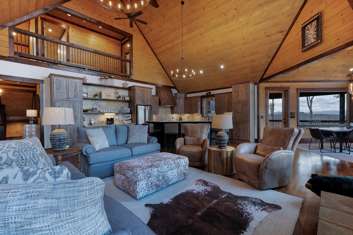 Entering your vacation home, you’ll be greeted by the large, open floor design so beautiful it’s hard to focus your gaze on any one area. The living room with spacious seating, stone laid gas fireplace and extensive windows brings visions of cozy evenings around a crackling fire and friends. The large kitchen, including a gas stove with 6 burners, plus grill plate and two ovens gets those creative culinary artist juices flowing. And the dining area with large surrounding windows, allows you to lose yourself in the beautiful views of those Blue Ridge mountains.