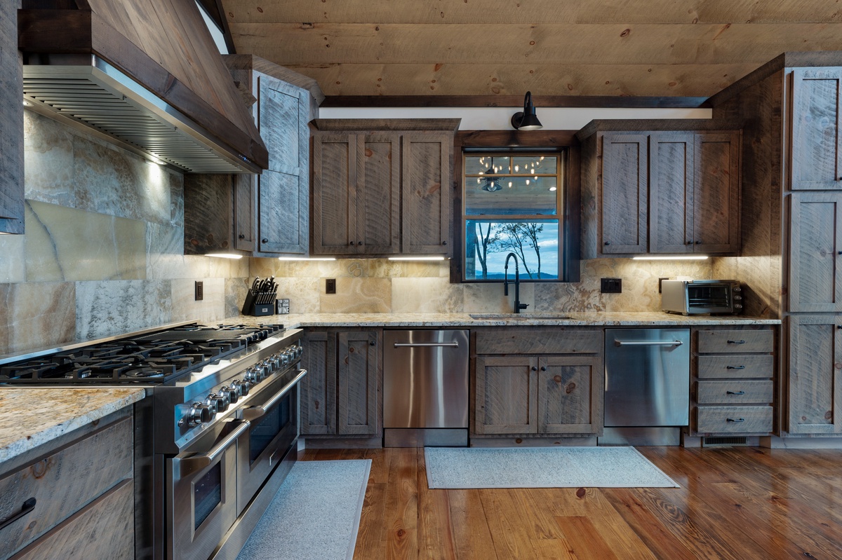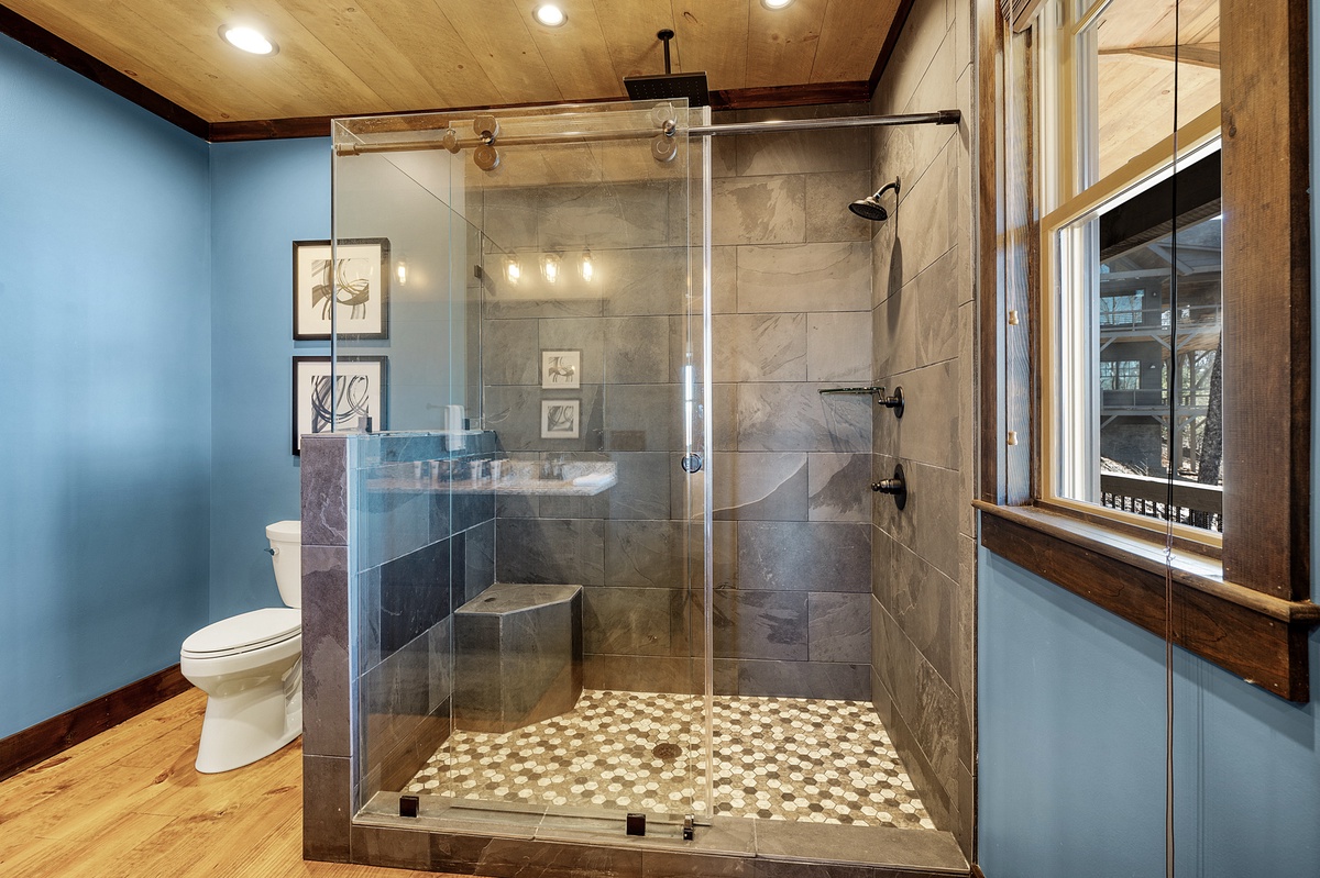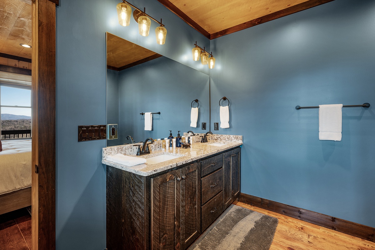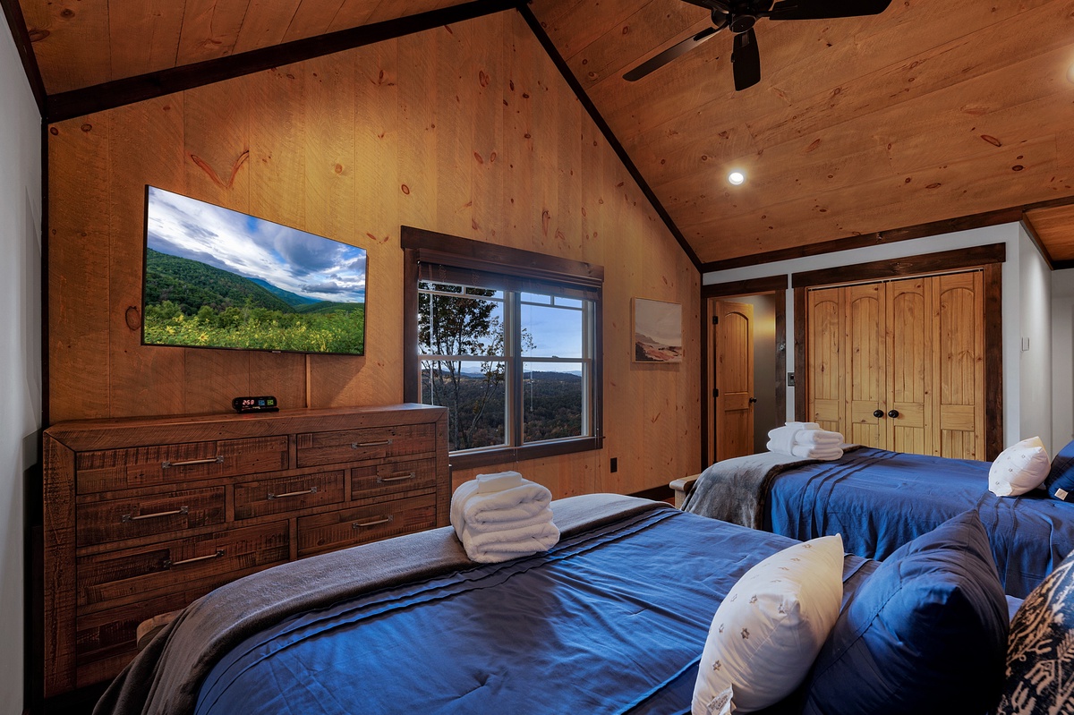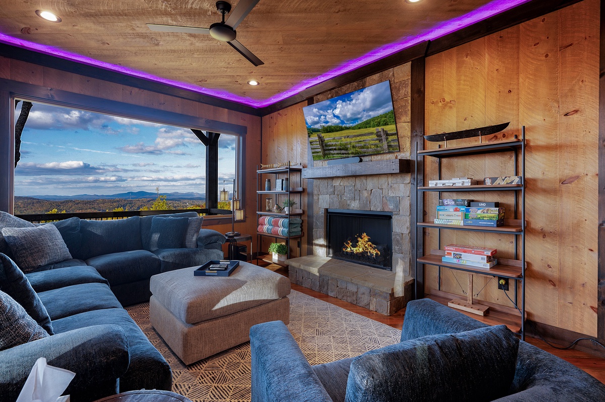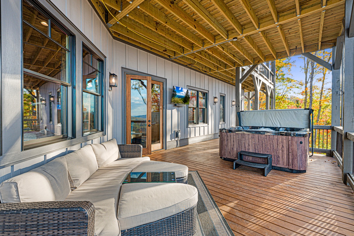 Entering your vacation home, you’ll be greeted by the large, open floor design so beautiful it’s hard to focus your gaze on any one area. The living room with spacious seating, stone laid gas fireplace and extensive windows brings visions of cozy evenings around a crackling fire and friends. The large kitchen, including a gas stove with 6 burners, plus grill plate and two ovens gets those creative culinary artist juices flowing. And the dining area with large surrounding windows, allows you to lose yourself in the beautiful views of those Blue Ridge mountains.