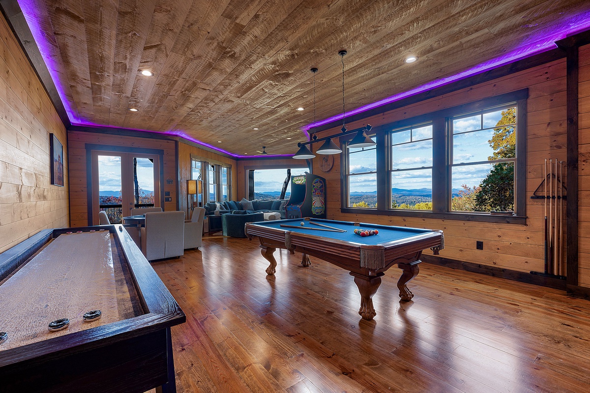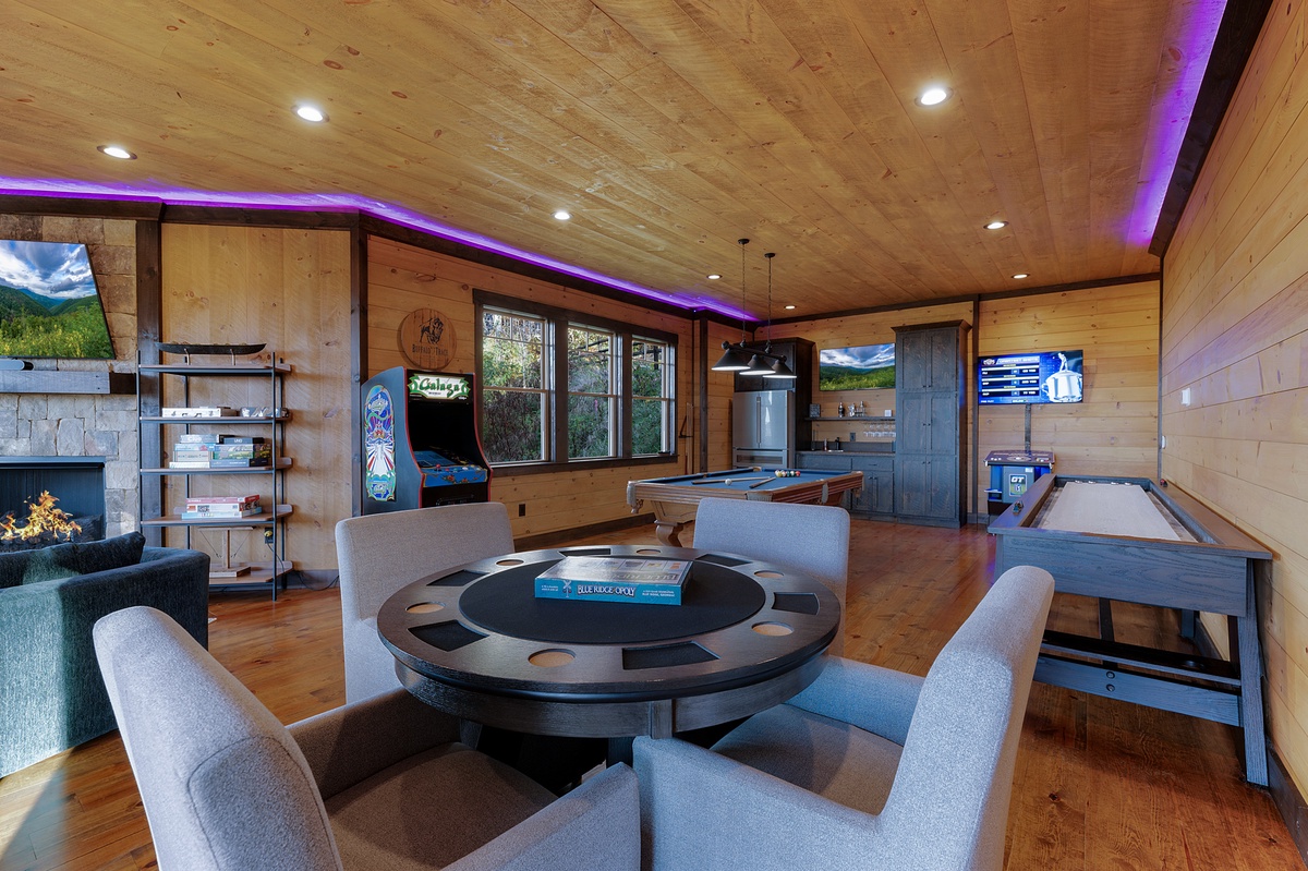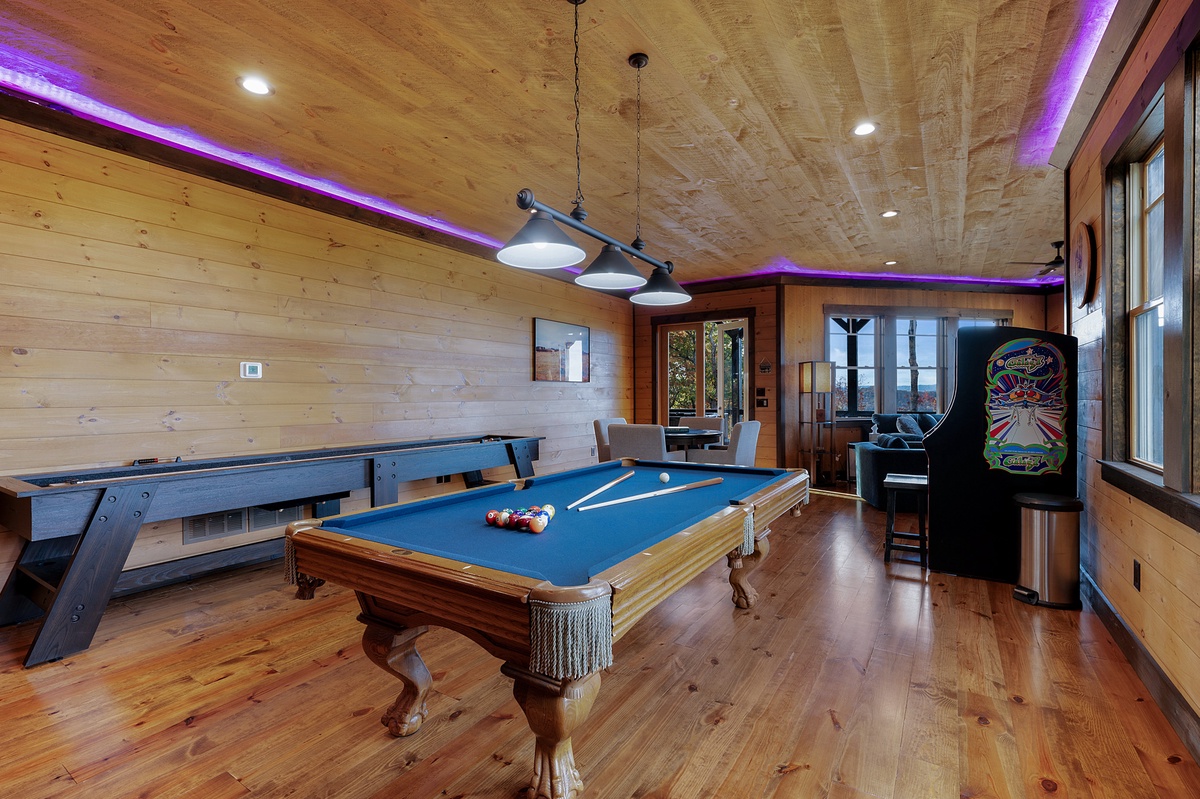 - Entertainment room with pool table, arcade, card table, colorful chaning ceiling lights