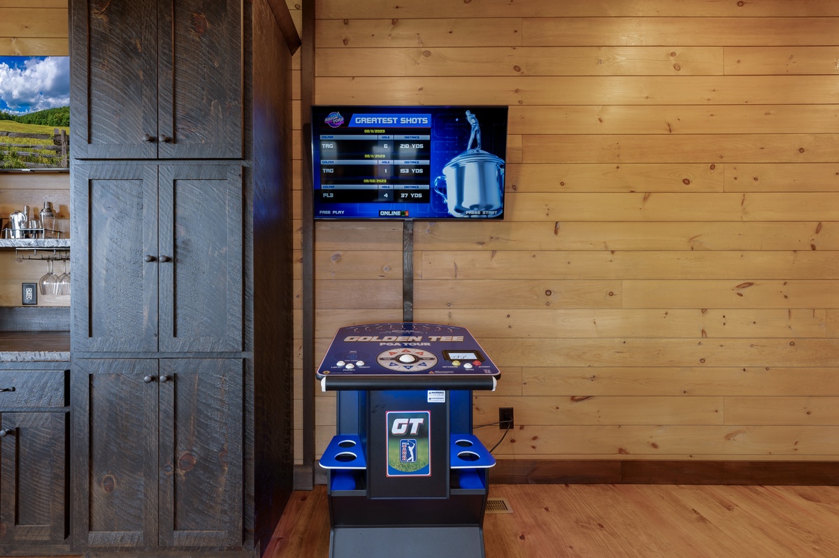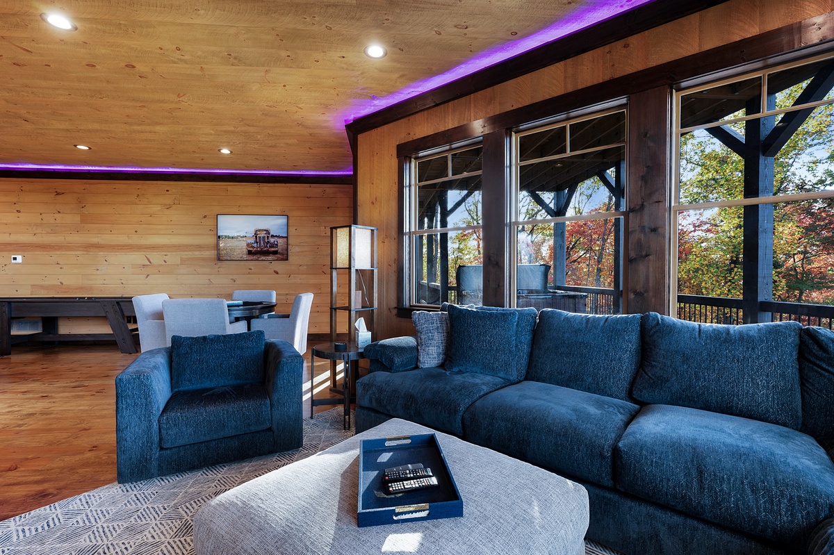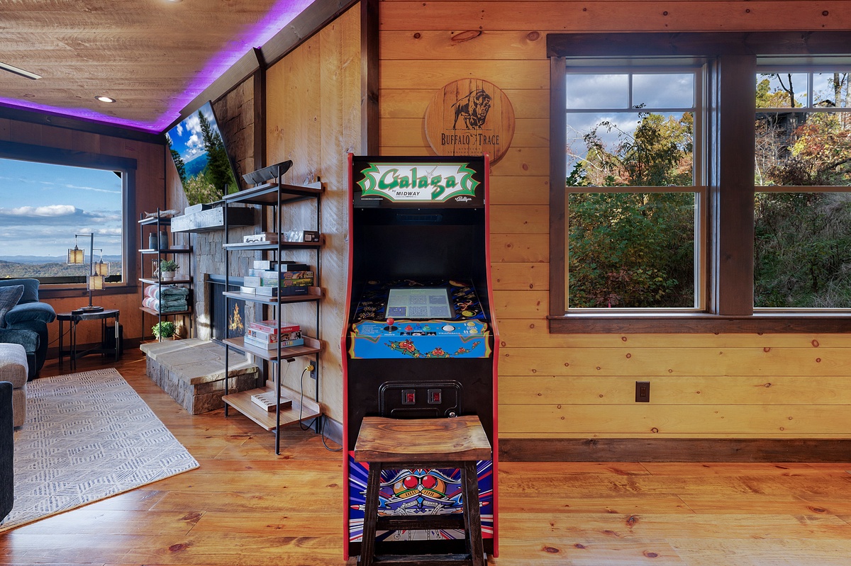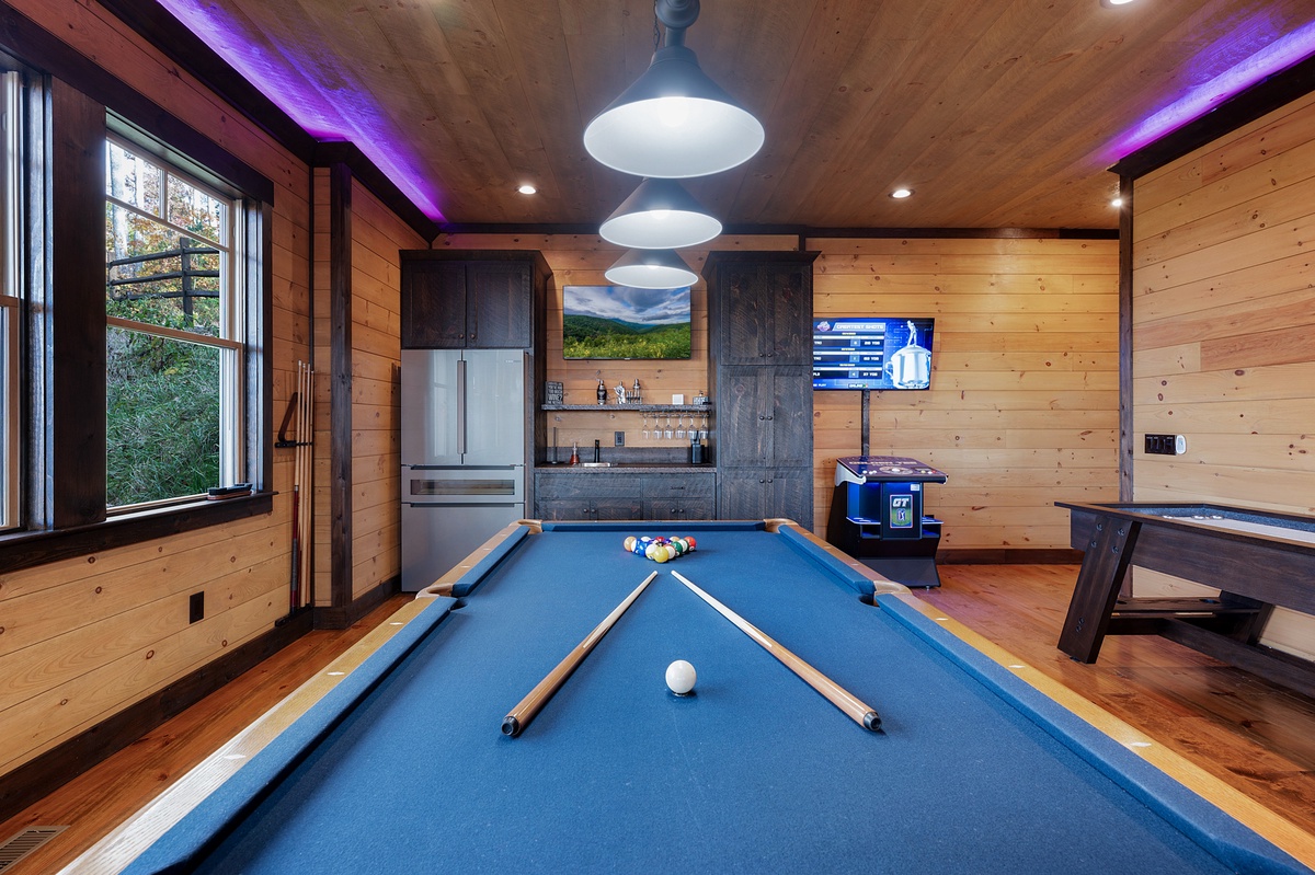 - Entertainment room with pool table, arcade, card table, colorful chaning ceiling lights
