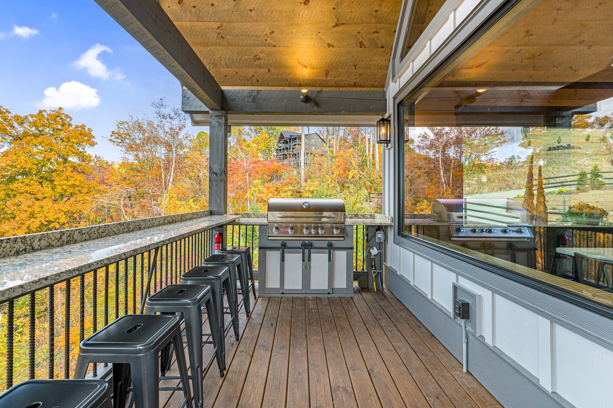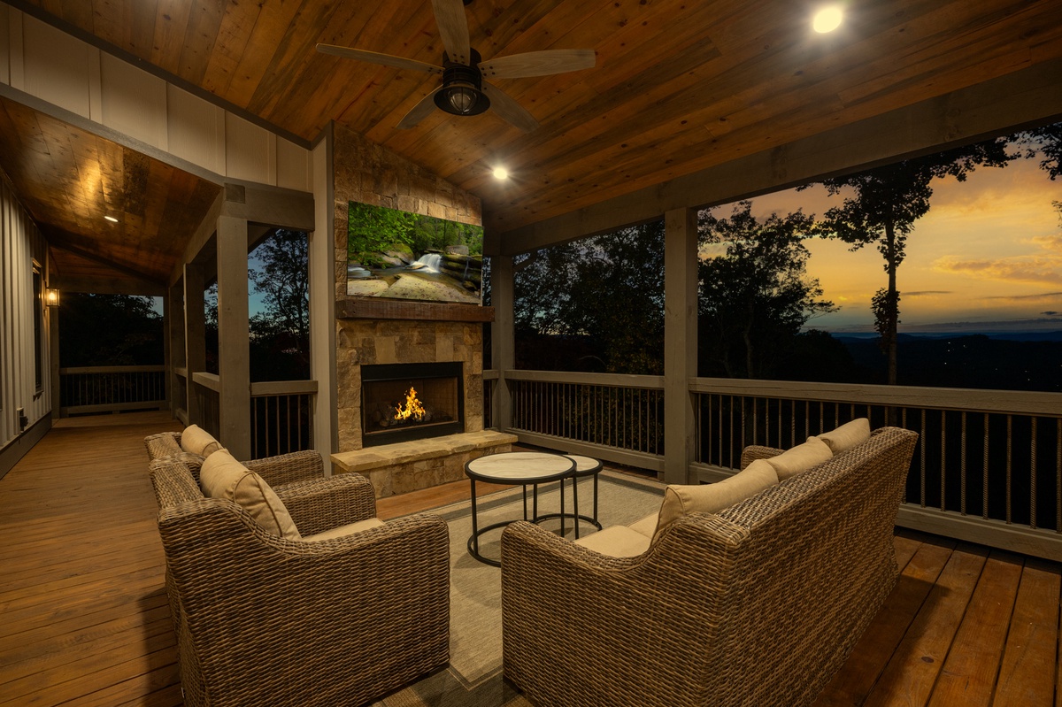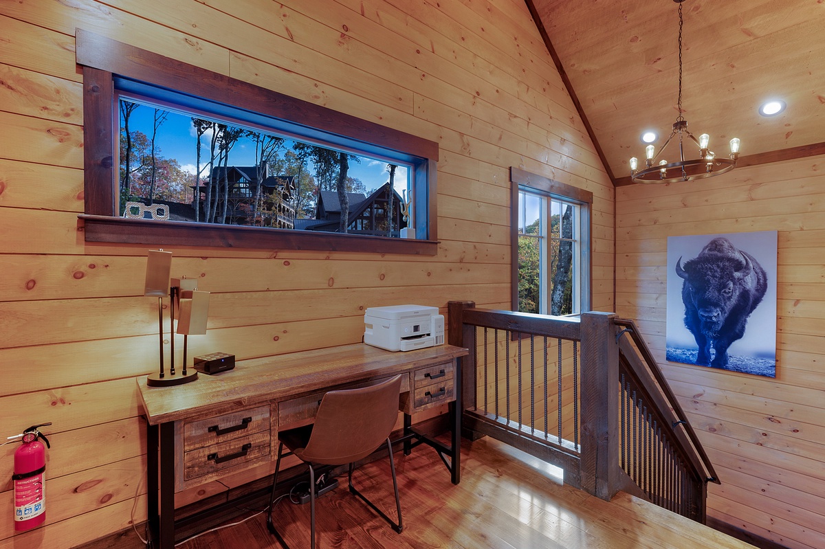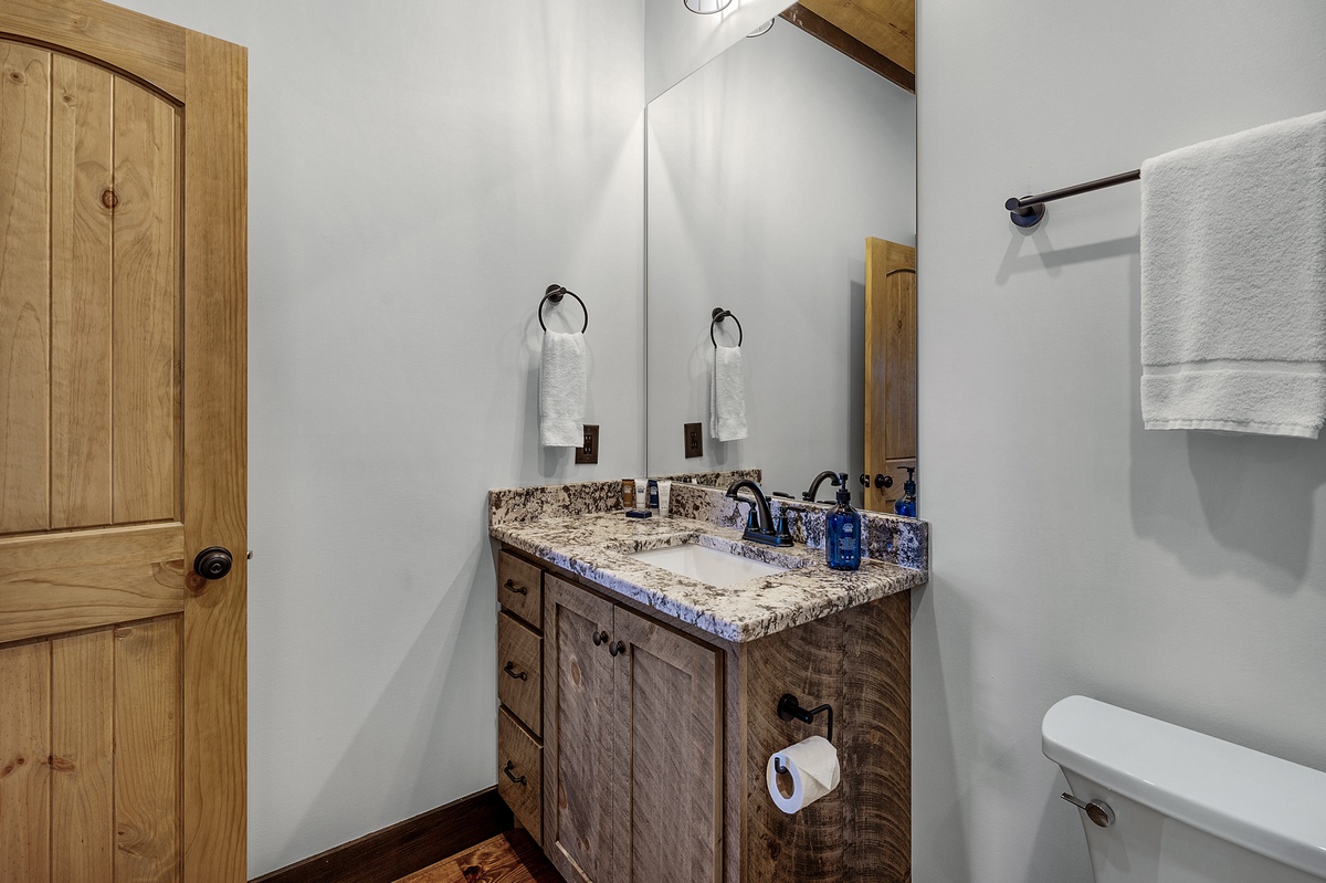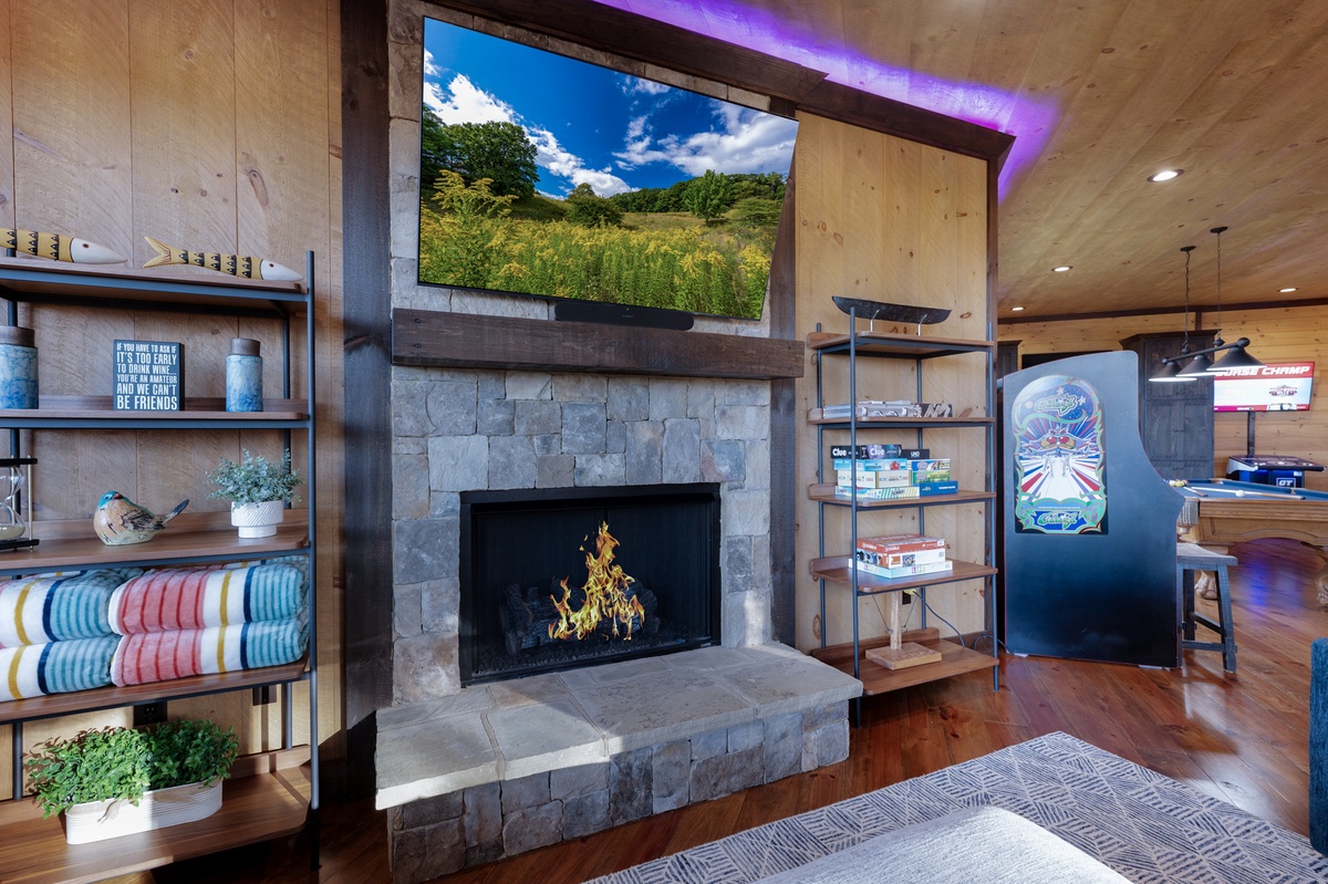 Realizing there are some who simply cannot break away from work the whole time, you’ll be pleased with the workstation in the loft. But for those who can break away, the spacious lower-level provides an entertainment area to meet everyone’s desire. Besides the new Golden Tee arcade, shuffleboard table, pool table, and card table; there is an inviting living room with plush seating, gas fireplace and TV. Further relaxation can also be found on either deck. The lower deck hosts a hot tub, sofa bed and TV. The entry level deck provides comfortable seating around a gas fireplace and TV as well as a built in grilling station with high top bar seating. Both with long range views of the mountains. As the sun disappears over the mountain top, escape to the flagstone fire pit area to reminisce about the days adventures while roasting marshmallows under the star lit sky.