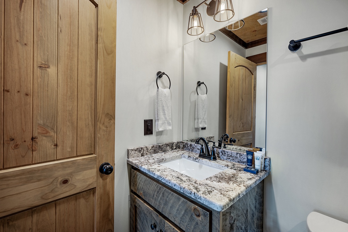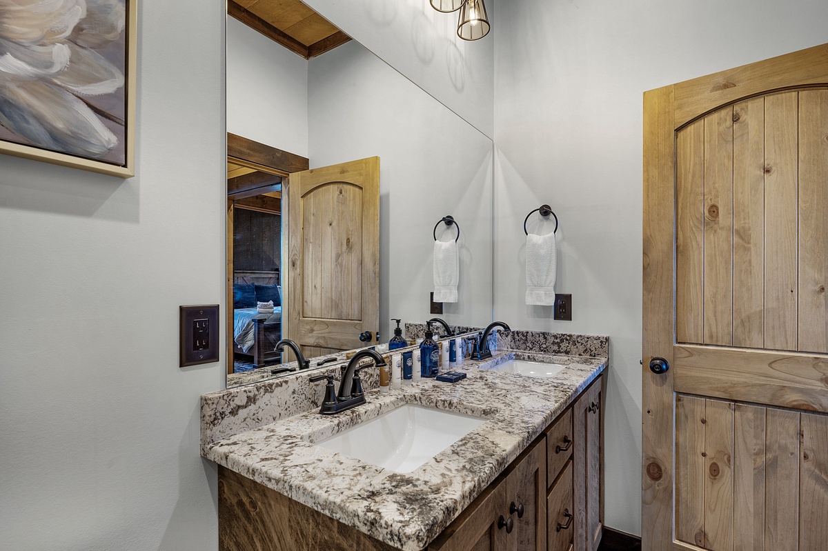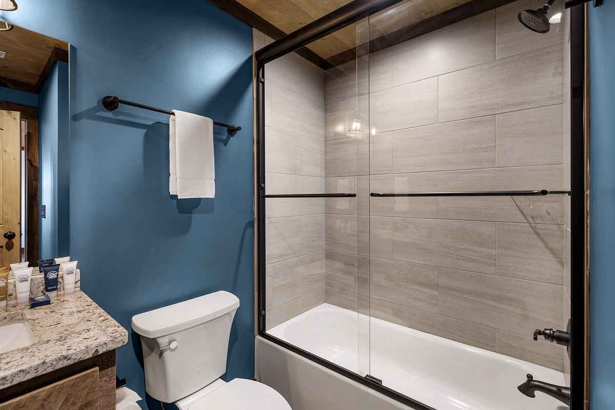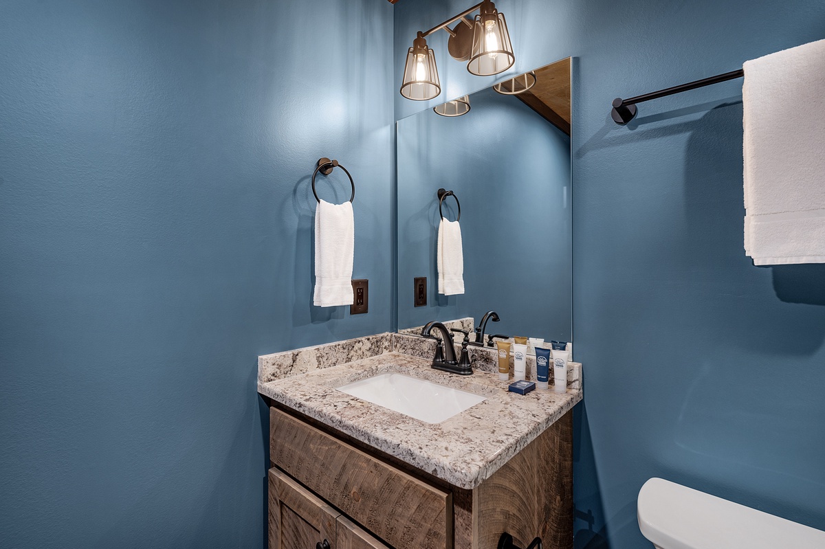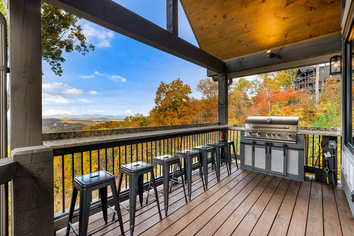 Realizing there are some who simply cannot break away from work the whole time, you’ll be pleased with the workstation in the loft. But for those who can break away, the spacious lower-level provides an entertainment area to meet everyone’s desire. Besides the new Golden Tee arcade, shuffleboard table, pool table, and card table; there is an inviting living room with plush seating, gas fireplace and TV. Further relaxation can also be found on either deck. The lower deck hosts a hot tub, sofa bed and TV. The entry level deck provides comfortable seating around a gas fireplace and TV as well as a built in grilling station with high top bar seating. Both with long range views of the mountains. As the sun disappears over the mountain top, escape to the flagstone fire pit area to reminisce about the days adventures while roasting marshmallows under the star lit sky.