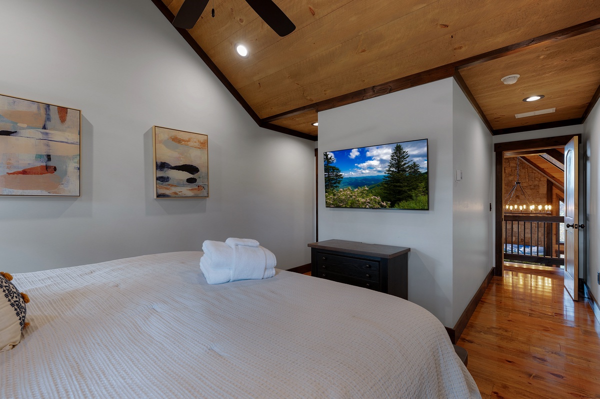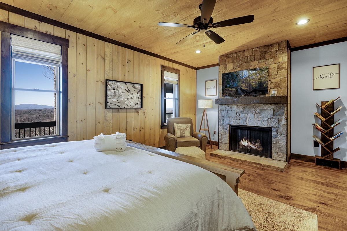 As all bedrooms provide mountain views, it may be hard to pick your favorite. But my bottom dollar would rest on the master bedroom with its private fireplace. How romantic can you get!