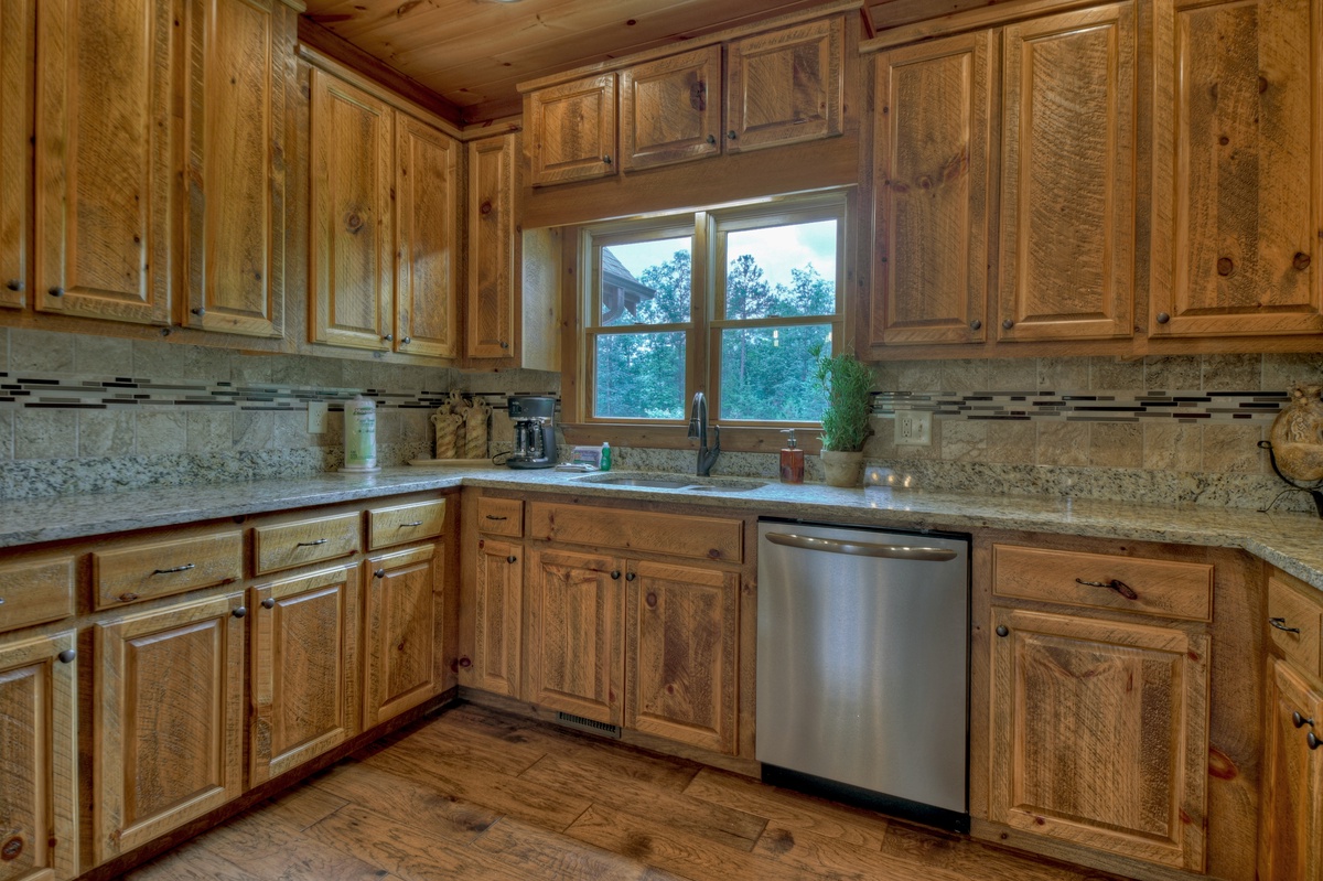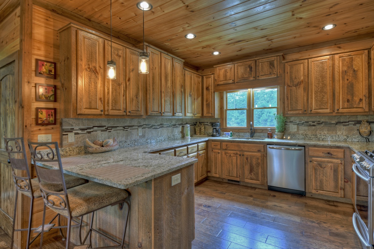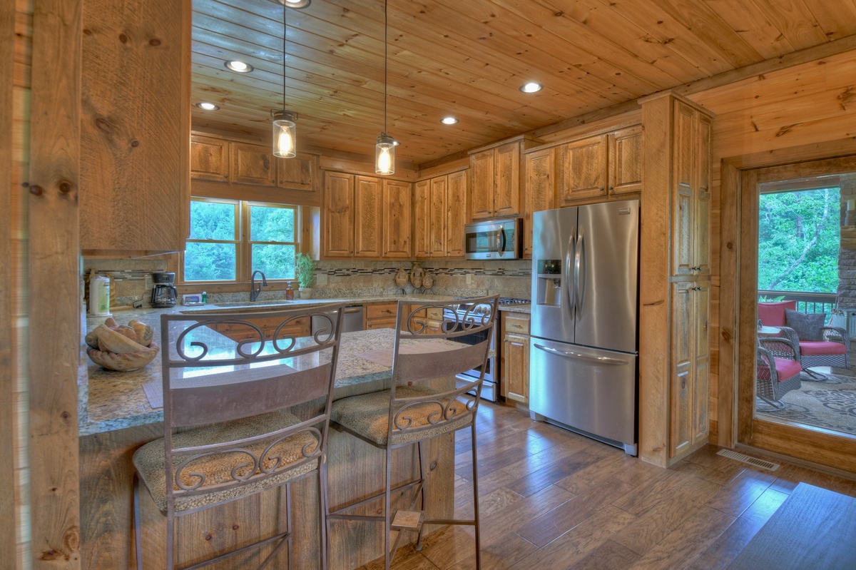 Inside you'll find an elegant mix of tongue-n-groove and rough sawn wood, hardwood & tile floors throughout. The main level offers great room with plenty of windows for natural lighting, a stone gas log fireplace and cathedral ceiling. The spacious kitchen with plenty of counterspace, granite countertops, stainless appliances, and a gas range. The dining table seats eight comfortably and rounds out the open concept living.
