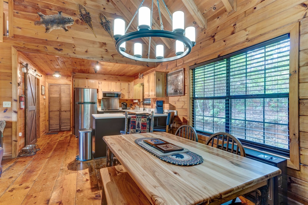 The cabin has a spacious open floor plan from the kitchen to dining room and living room, enabling guests to have many places to sit and still converse with someone in the kitchen. There are also many windows in this cabin making for some great natural light and also makes it easy to enjoy the mountain views from inside the property. Whether you are looking to get away from everyone, bring your work with you while taking in the fresh mountain air, or a long vacation, Yanasa Retreat is a wonderful place to come and relax!